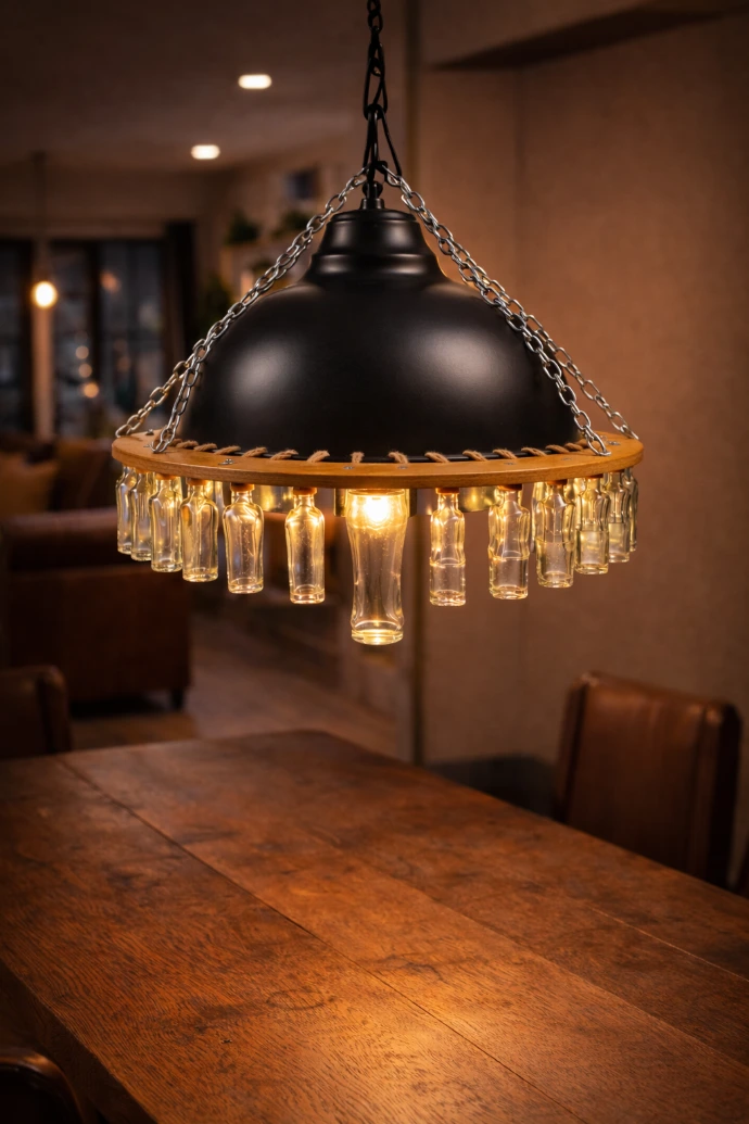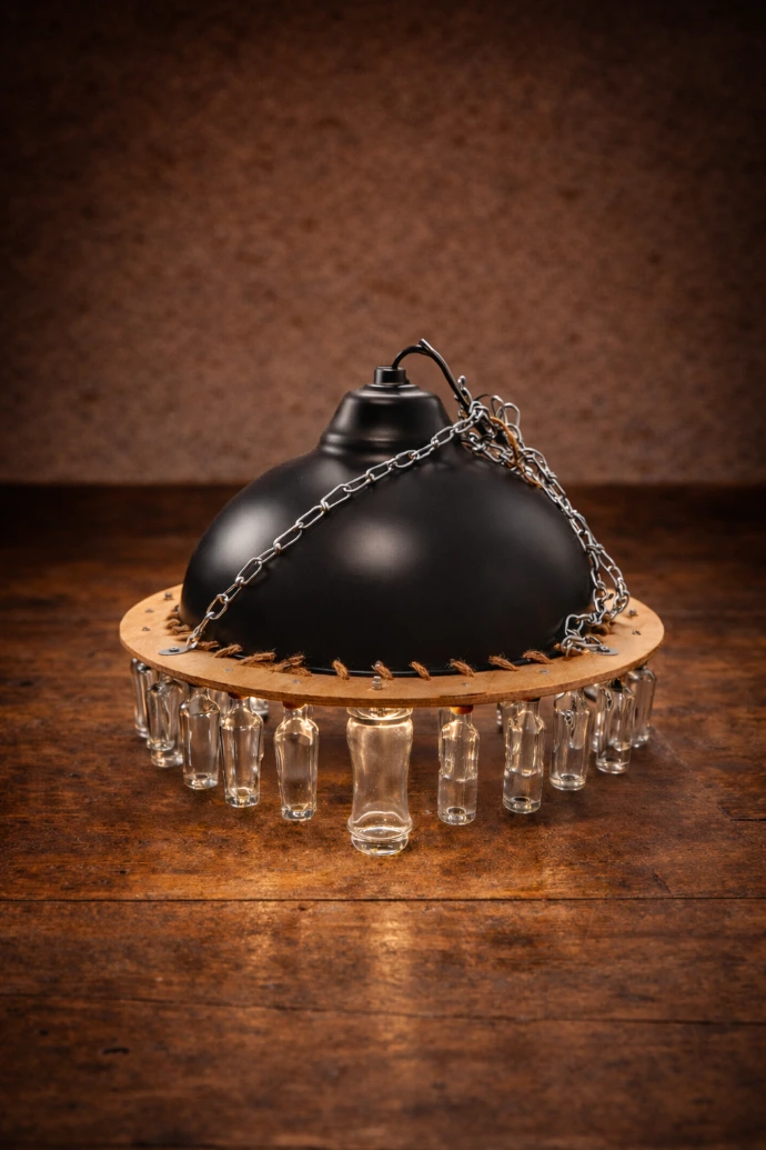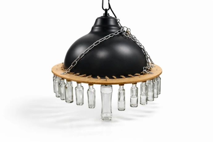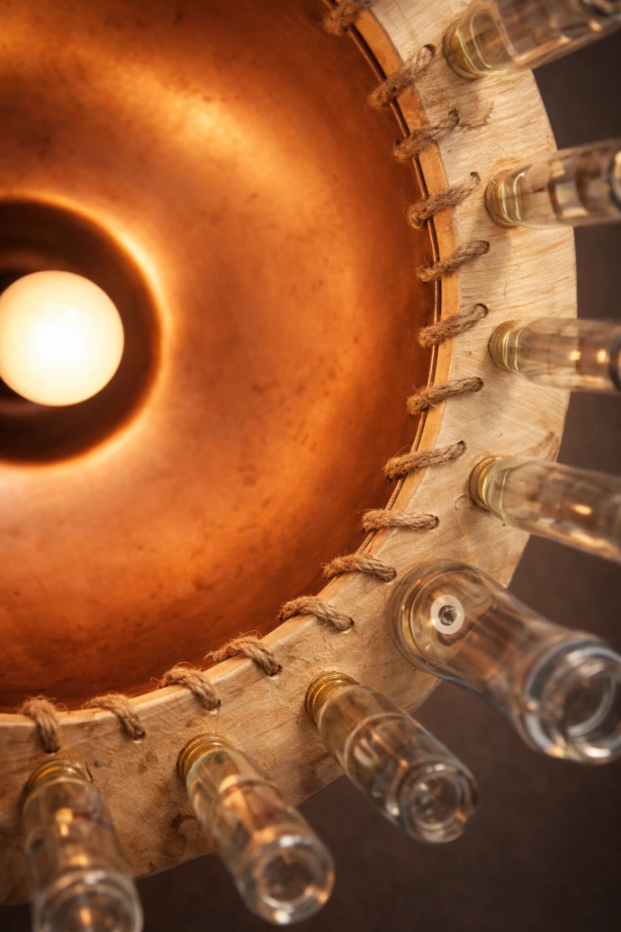 Une cuve noire vintage à intérieur bronzé devient le cœur de cette suspension.