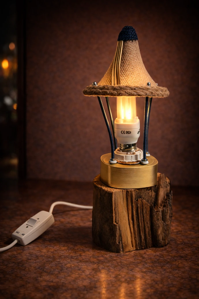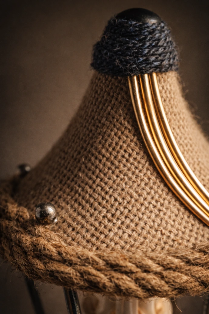 Il soutient un couvercle de boîte de café, lui-même surmonté d’un toit iconique en toile de jute, issu d’un ancien ventilateur.