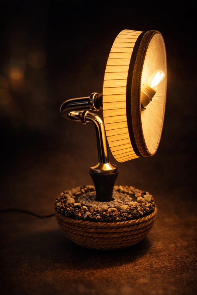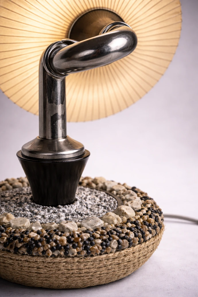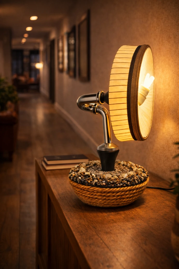 Une grille de ventilateur modifiée, recouverte de satin jaune ocre, diffuse une lumière chaude et filtrée. Elle est portée par un tuyau sanitaire en acier trempé, inséré dans la gorge d’une carafe en verre scellée dans un socle en béton habillé de corde de bananier.