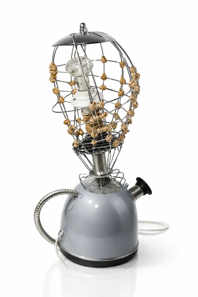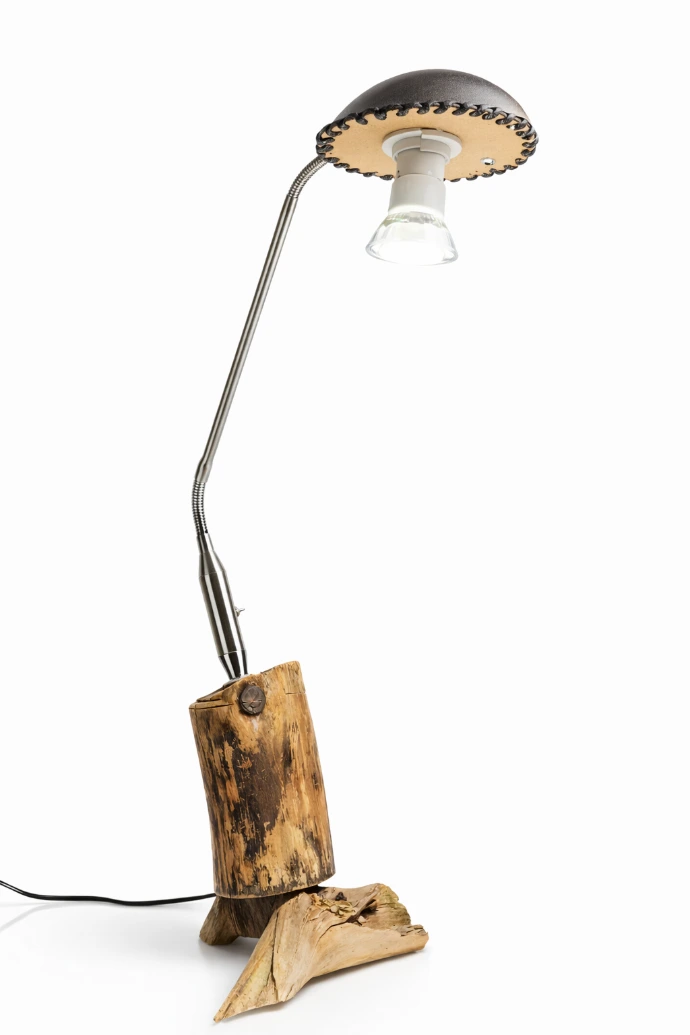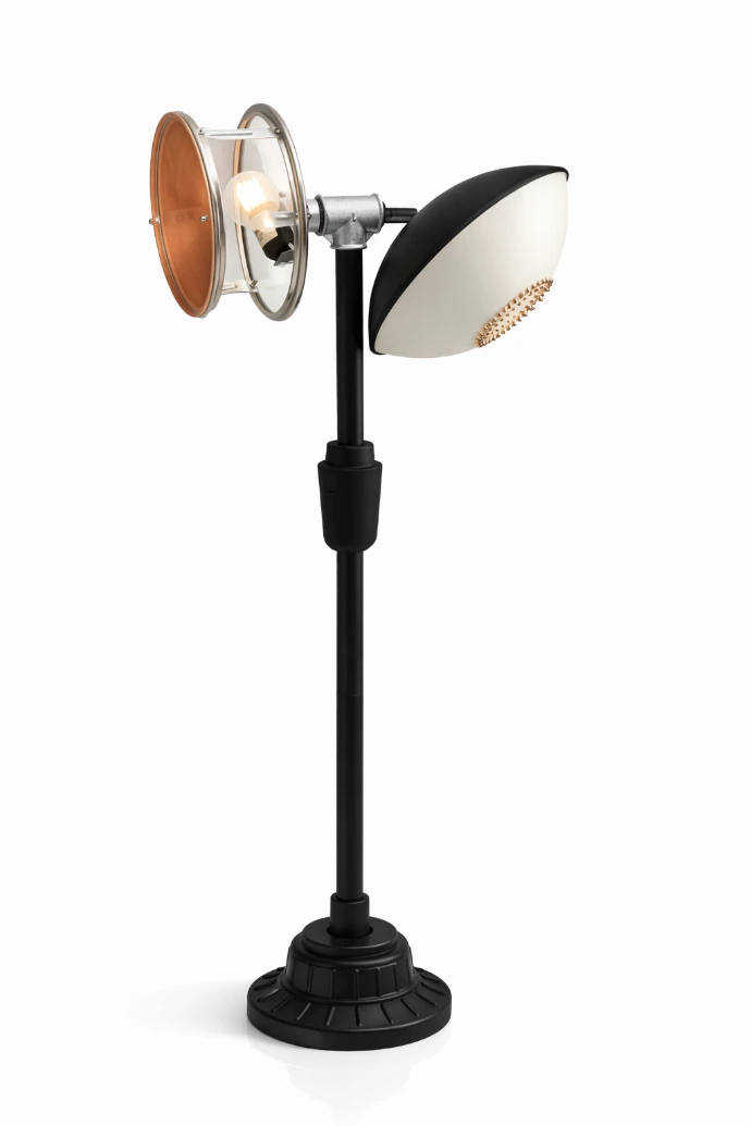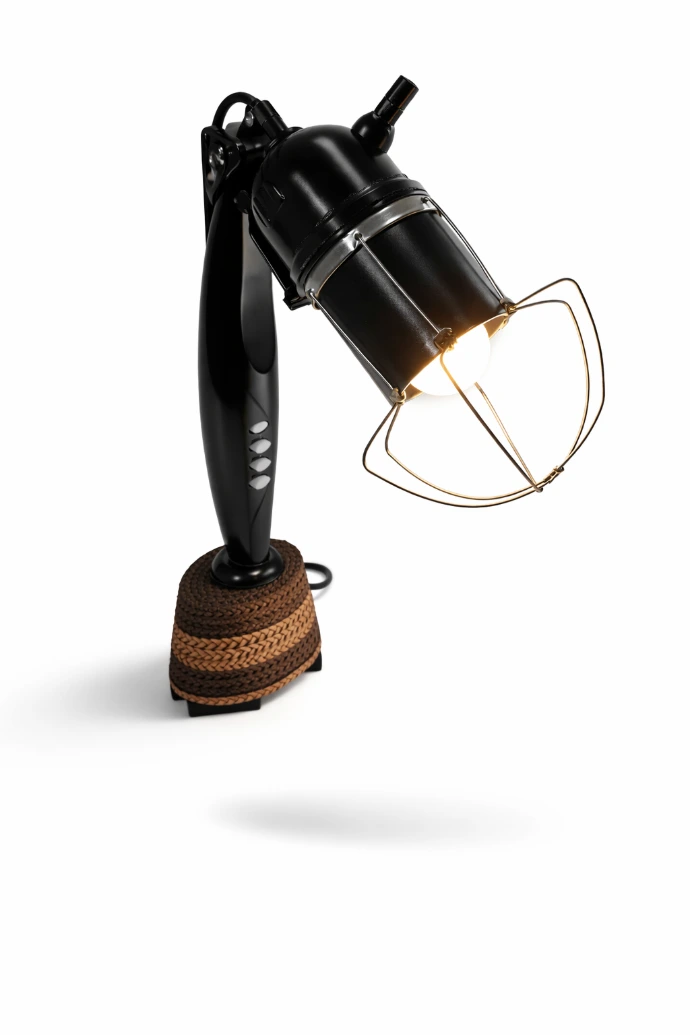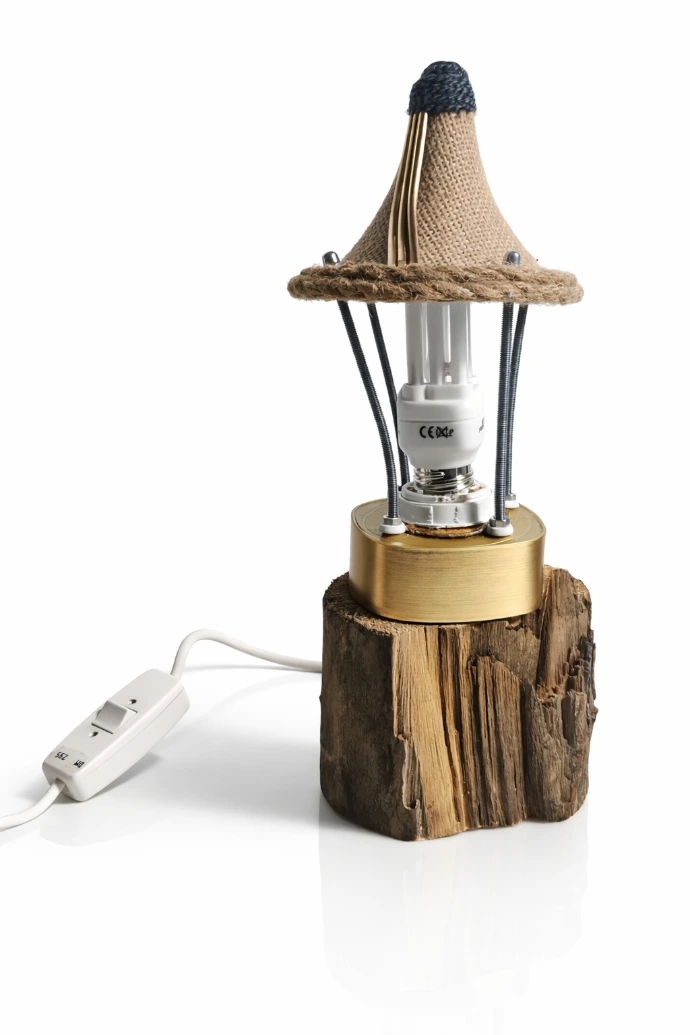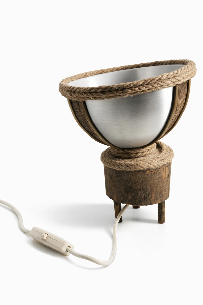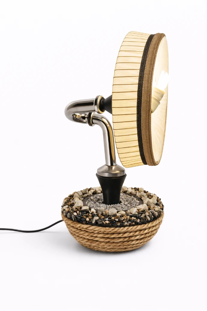 Lampe de table issue de matériaux revalorisés, associant métal et éléments récupérés pour un éclairage d’ambiance.