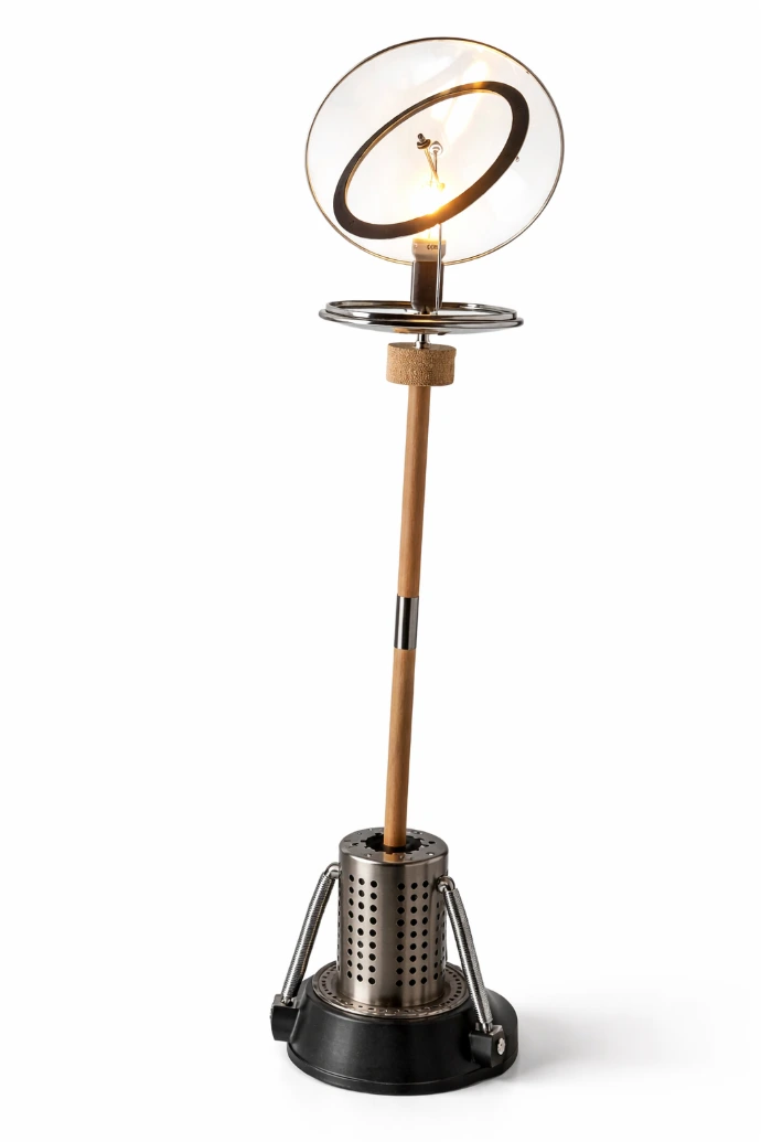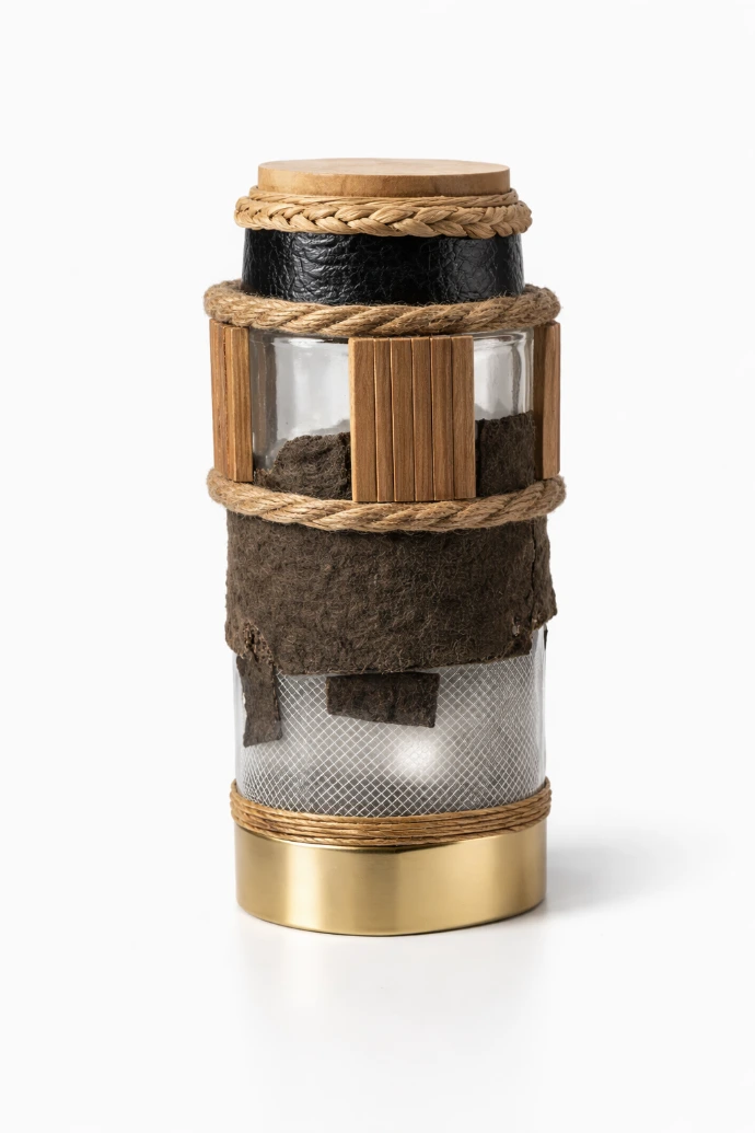 Lampe d’ambiance, assemblée à partir de matériaux revalorisés, conçue pour diffuser une lumière douce et chaleureuse.
