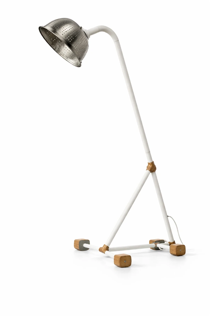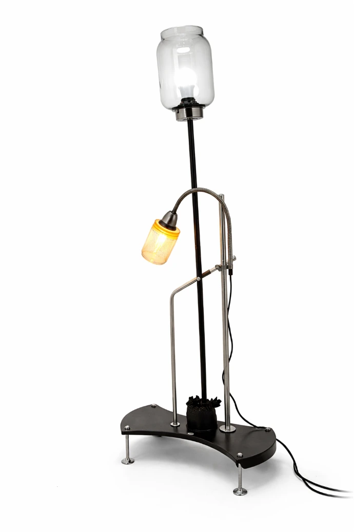 Lampe d’ambiance upcyclée, associant métal et éléments revalorisés, caractérisée par une silhouette élancée et un éclairage dirigé.