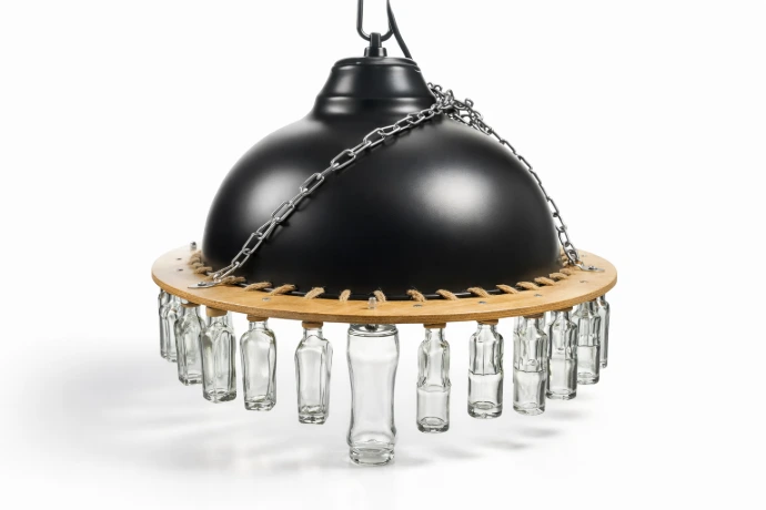 Objet lumineux upcyclé,structuré autour d’un cerceau métallique et d’éléments récupérés, pensé comme une pièce graphique diffusant une lumière d’ambiance.