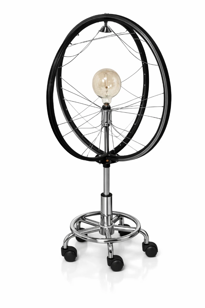 Objet lumineux sculptural, conçu à partir d’un cerceau de roue et d’éléments métalliques revalorisés, diffusant une lumière graphique et aérienne