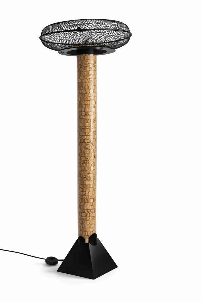Lampe sur pied sculpturale, composée d’un fût cylindrique en matériaux revalorisés et d’un diffuseur métallique, offrant un éclairage vertical et architectural.