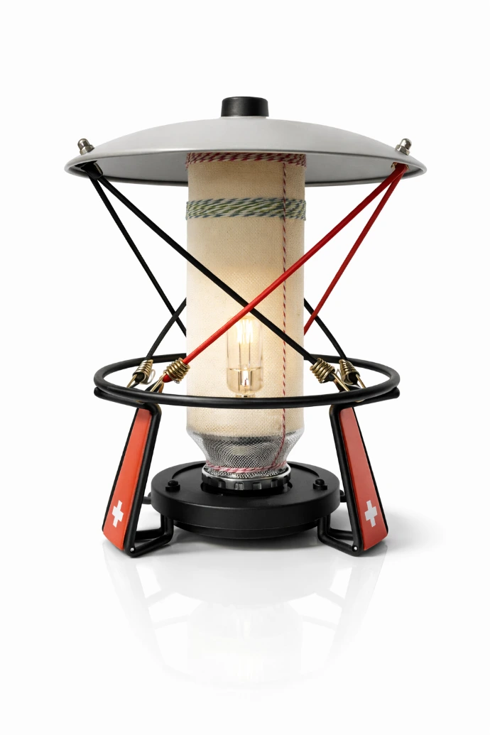Lampe d’ambiance, réalisée à partir de matériaux revalorisés, conçue comme un volume lumineux structurant.