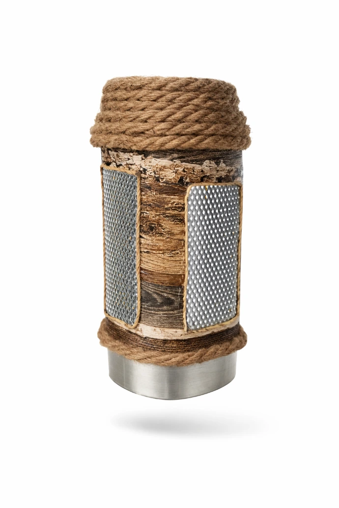 Objet lumineux d’ambiance, assemblé à partir de matériaux revalorisés, conçu comme une forme compacte diffusant une lumière chaleureuse.