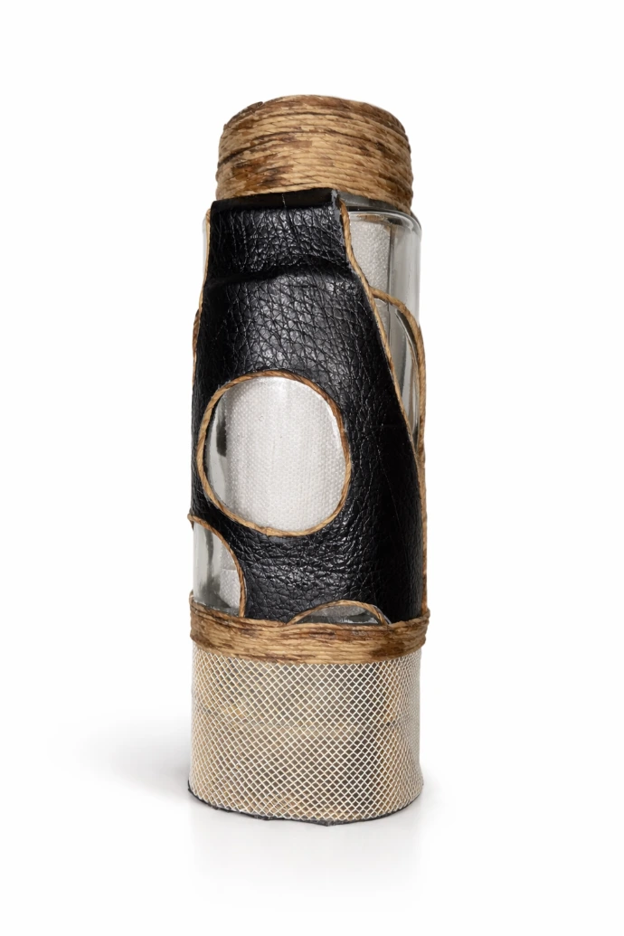 Objet lumineux sculptural, assemblé à partir de métal, cuir et éléments revalorisés, conçu comme une lampe d’ambiance à forte présence graphique.