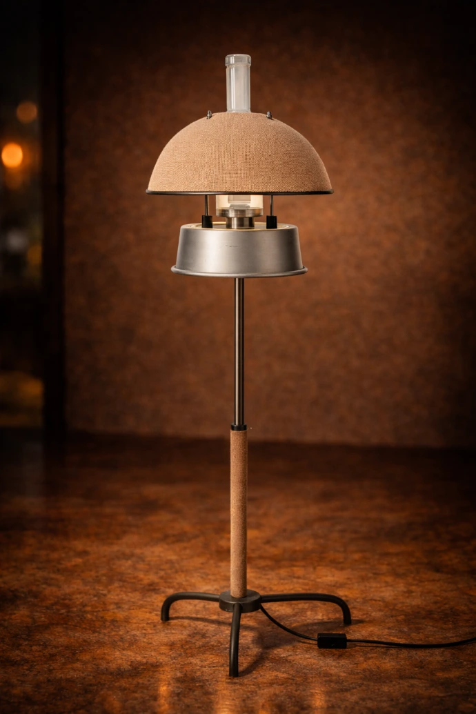 En dessous, un récipient en aluminium est maintenu par quatre tiges en acier.