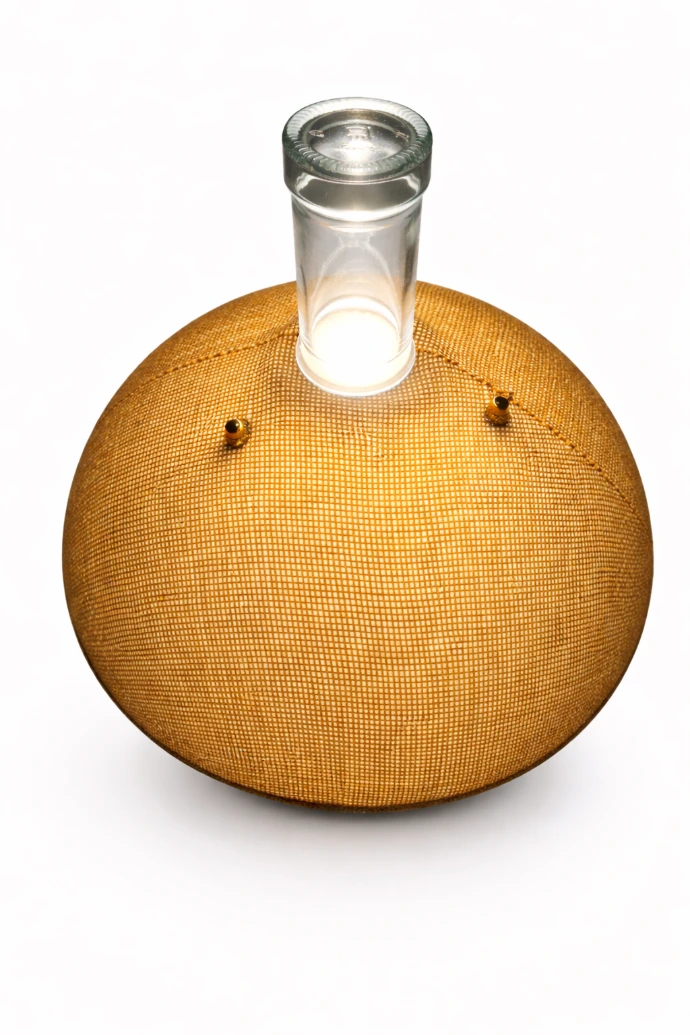 Un contenant de sel en verre recyclé cohabite avec un saladier recouvert de toile de jute.