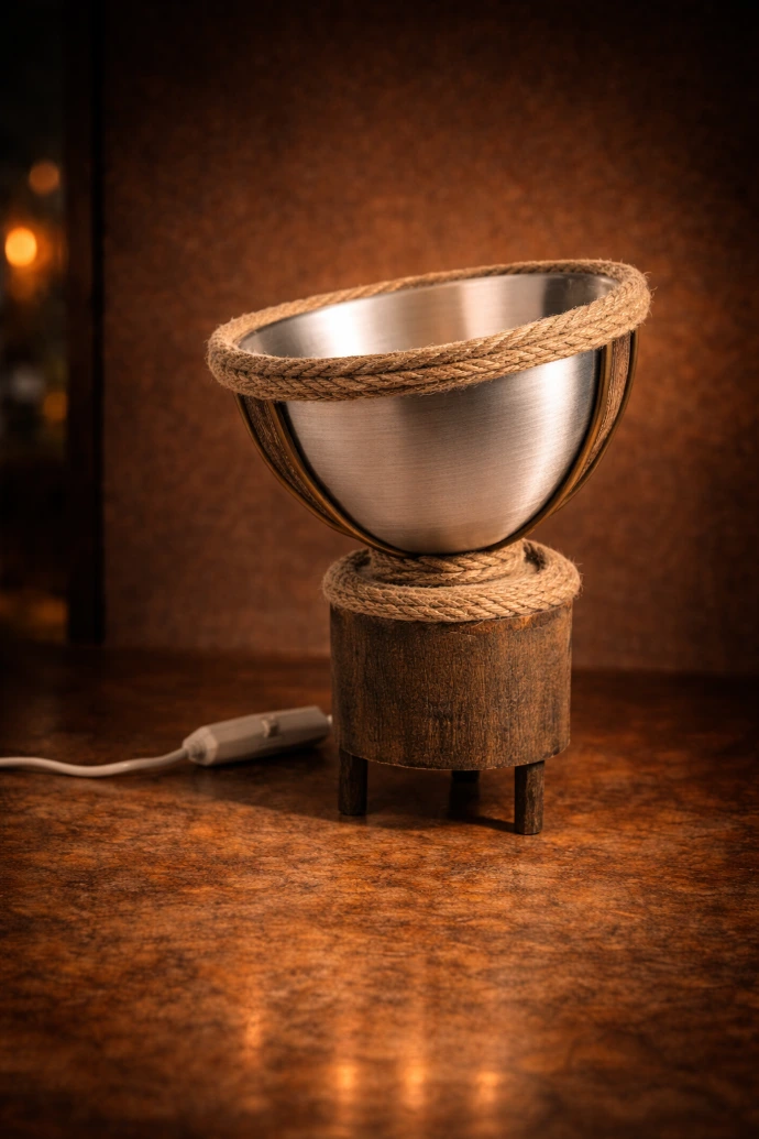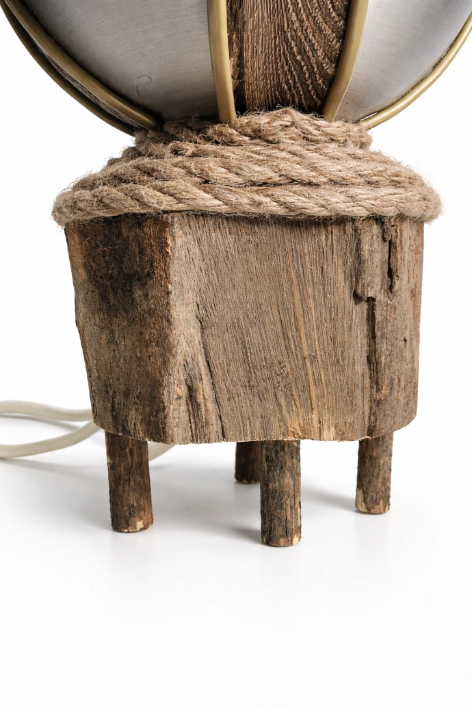 Il repose sur un tronc d’arbre tapissé de corde, soutenu par quatre pieds en bâtonnets.